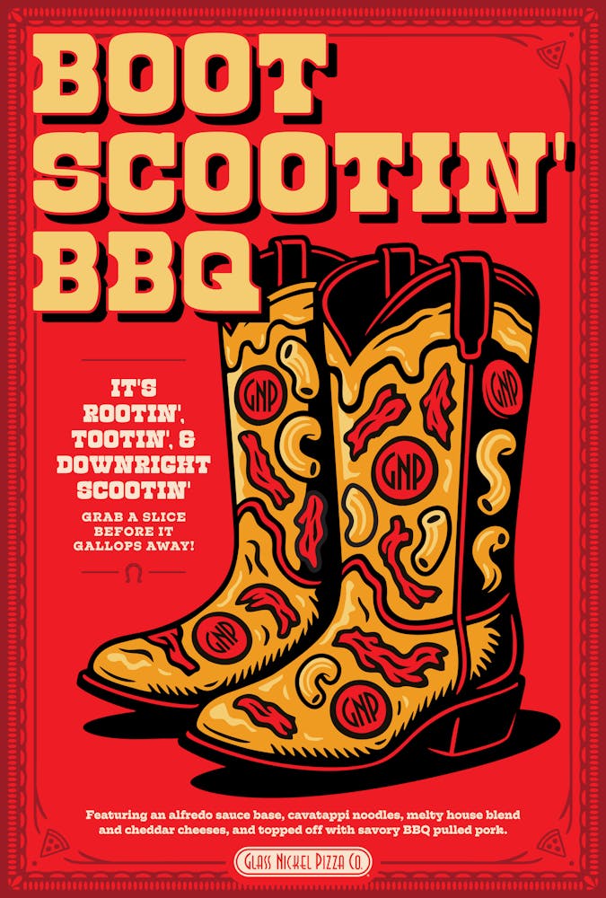 The "Pizza of the Month" began in 2010 at GNP Madison West with a Halloween special, the Pollo Diablo. Our POMs have grown to include special order ingredients, new combinations of current offerings, and recipe ideas from all of our GNP family. Each year we put our heads together for a POM selection party. We bring the best ideas to the table as we start to plan for the year ahead. We pick 6 of our favorites, then have our amazing design team come up with vintage movie poster themed images for each. Now, for the first time ever, we have collected and organized a history of ALL of our Pizza of the Month creations in one place! Take a look to see what our current feature is, the pizzas you loved from the past, which ones you might have missed, and which ones you hope we bring back!